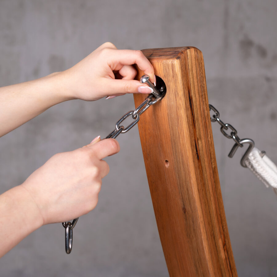 Die passende Spannweite für die jeweilige Hängematte wird mittels der Kette optimiert.