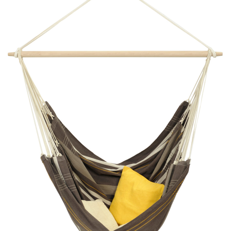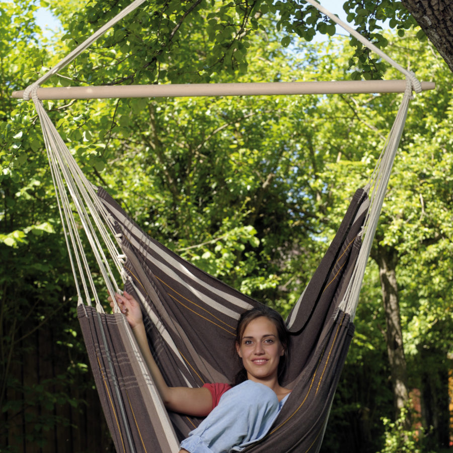 Die Stabbreite von 140 cm gewährt ein offenes, geräumiges Sitzen und der Stoff ist so lang, dass man mit ausgestreckten Beinen drin sitzen kann.